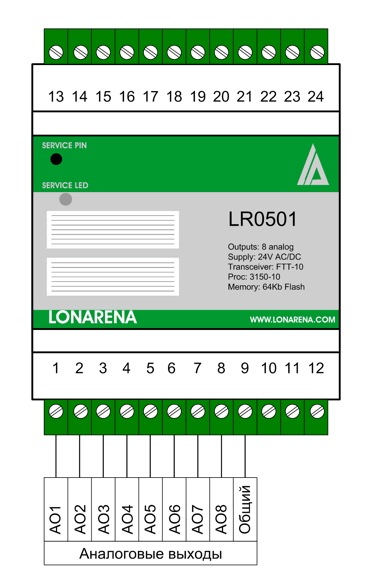 Контроллеры LR0501 предназначены для работы в системах управления на основе технологии LonWorks. Они оснащены сетевым интерфейсом TP/FT-10 (FTT-10) и могут быть частью распределенной системы управления в качестве устройства вывода аналоговых сигналов. Аналоговый сигнал может быть использован для управления диммерами, частотными регуляторами, приводами вентилей и воздушных заслонок и т.д. В качестве источника питания контроллера может служить трансформатор или блок питания с номинальным выходным напряжением 24 вольта.
