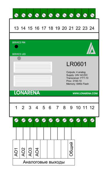 Контроллеры LR0601 предназначены для работы в системах управления на основе технологии LonWorks. Они оснащены сетевым интерфейсом TP/FT-10 (FTT-10) и могут быть частью распределенной системы управления в качестве устройства вывода аналоговых сигналов. Аналоговый сигнал может быть использован для управления диммерами, частотными регуляторами, приводами вентилей и воздушных заслонок и т.д. В качестве источника питания контроллера может служить трансформатор или блок питания с номинальным выходным напряжением 24 вольта.