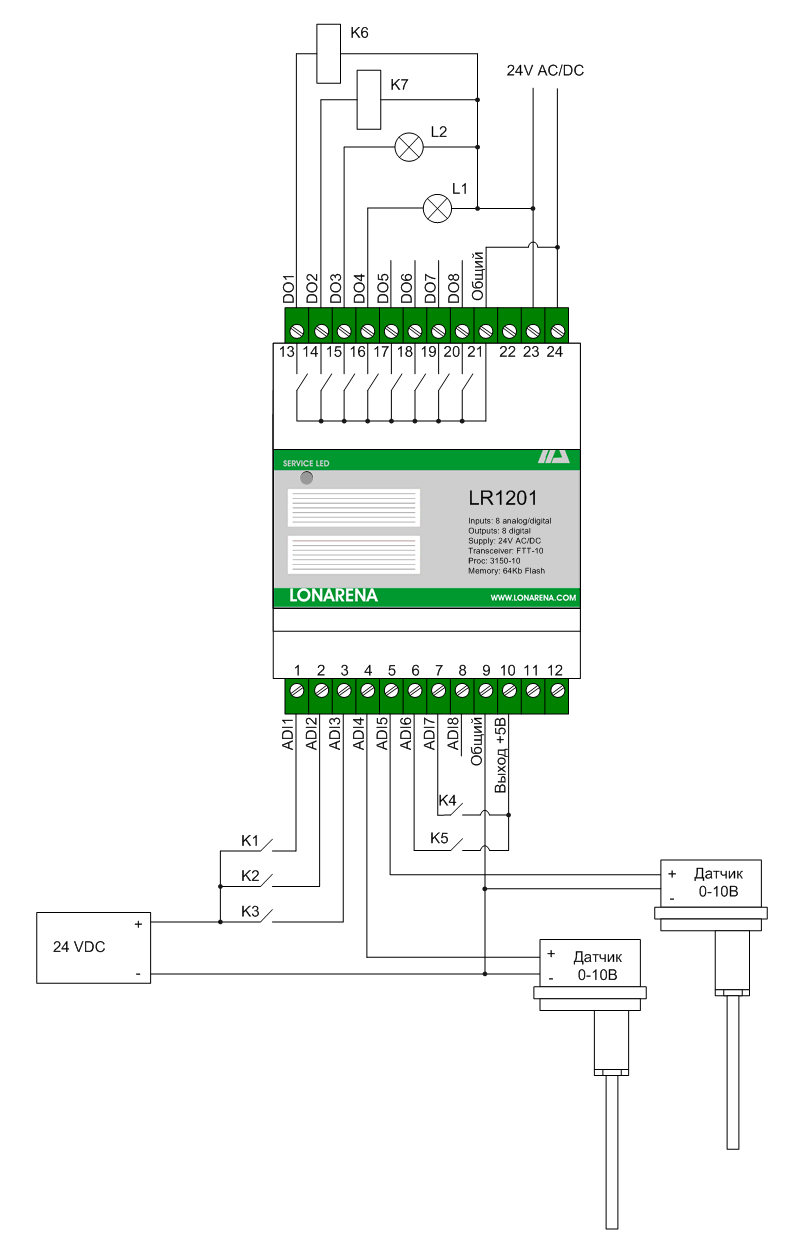 Контроллеры LR1201 предназначены для работы в системах управления на основе технологии LonWorks. Они оснащены сетевым интерфейсом TP/FT-10 (FTT-10) и могут быть частью распределенной системы управления, диспетчеризации, сбора данных в качестве устройства ввода дискретных и аналоговых сигналов и в качестве устройства вывода дискретных сигналов. Источником дискретного сигнала может быть сухой контакт или постоянное напряжение не более 30 вольт. В качестве источника питания контроллера может служить трансформатор или блок питания с номинальным выходным напряжением 24 вольта.