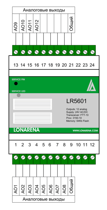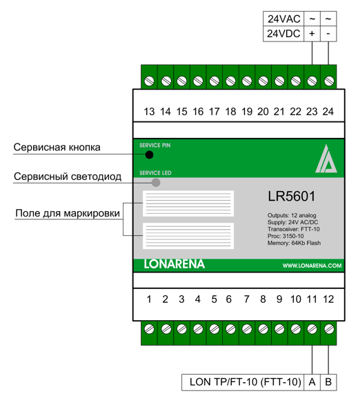 Контроллеры LR5601 предназначены для работы в системах управления на основе технологии LonWorks. Они оснащены сетевым интерфейсом TP/FT-10 (FTT-10) и могут быть частью распределенной системы управления в качестве устройства вывода аналоговых сигналов. Аналоговый сигнал может быть использован для управления диммерами, частотными регуляторами, приводами вентилей и воздушных заслонок и т.д. В качестве источника питания контроллера может служить трансформатор или блок питания с номинальным выходным напряжением 24 вольта.